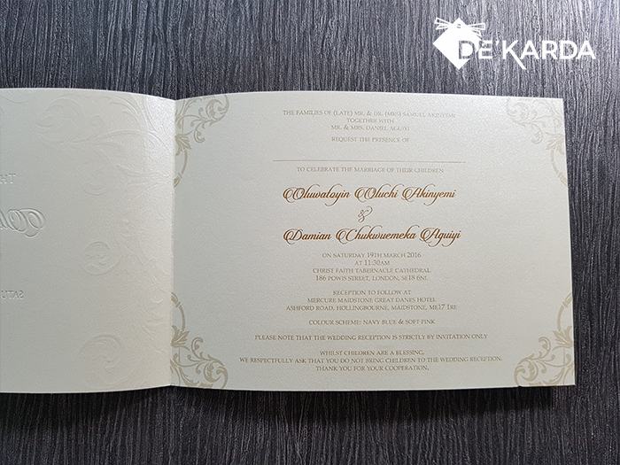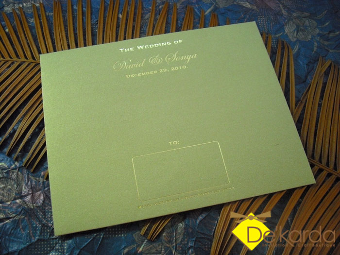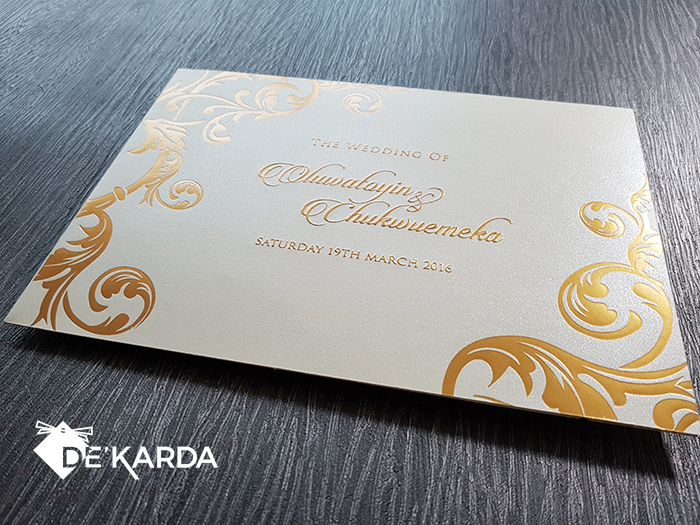 - content 1 page, printed in regular ink, only the bride and groom names in hot foil