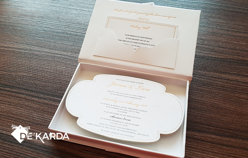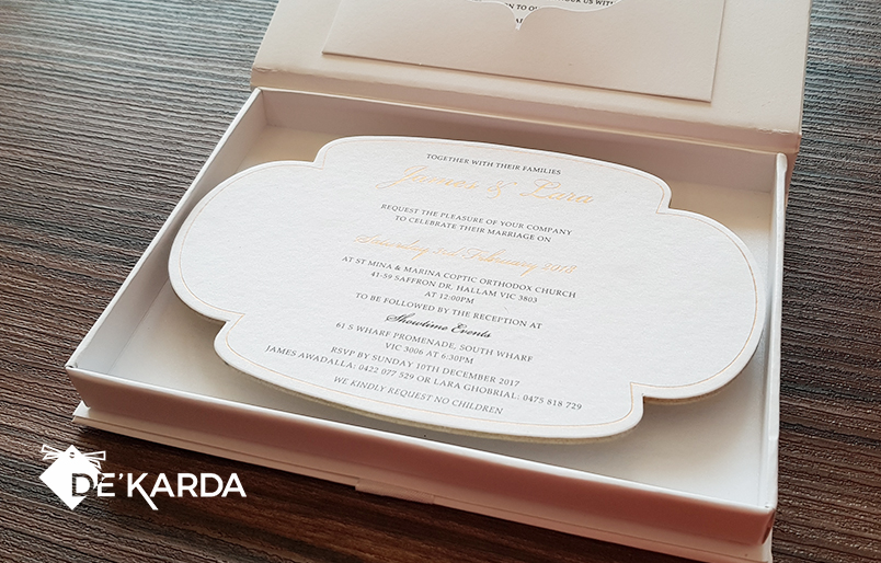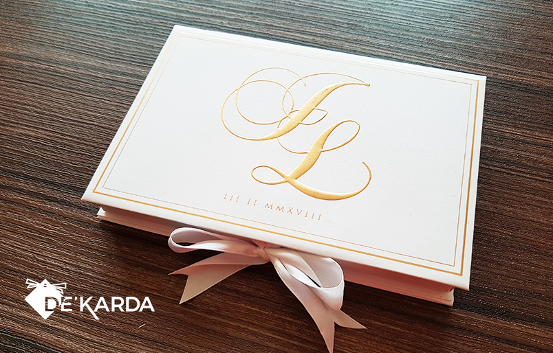 - boxed invitation size 19.5 x 13.5 cm printed in hot foil and embossed