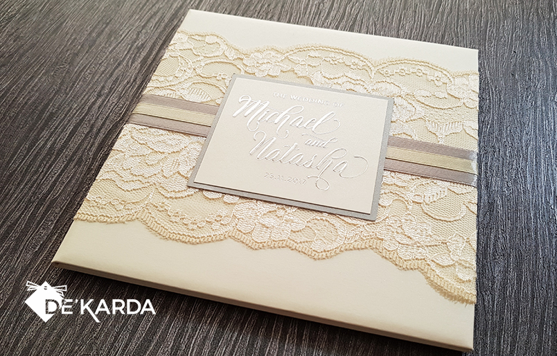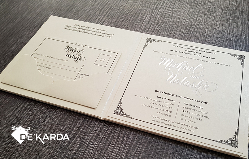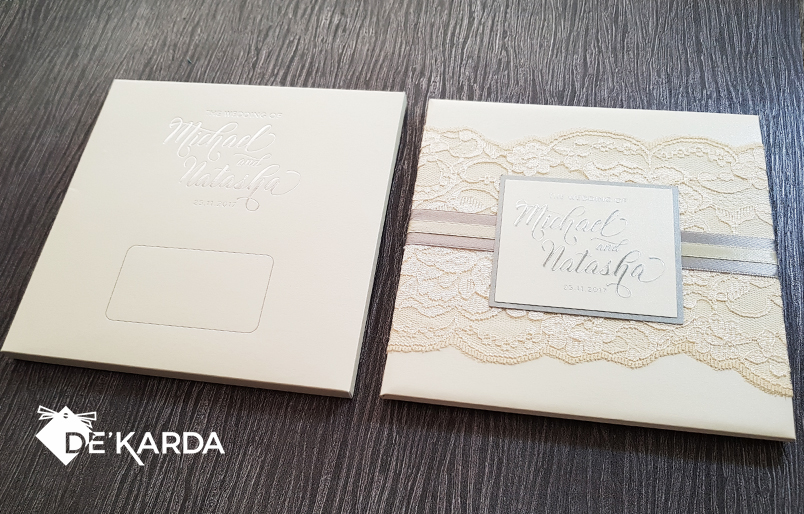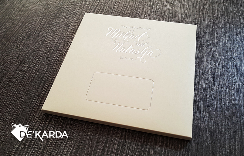 - hard cover invitation size 15x15cm printed in hot foil and embossed