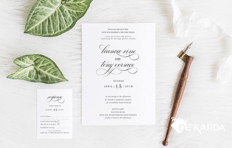 You can be sure that your loved ones will delight in the simple elegance of our wedding invitation. Elegant lettering and swirling calligraphy fill the page with your wedding day details, each word easy to read in deep black against the white background. This twist on a classic design is perfect for the hearts and homes of your many guests.