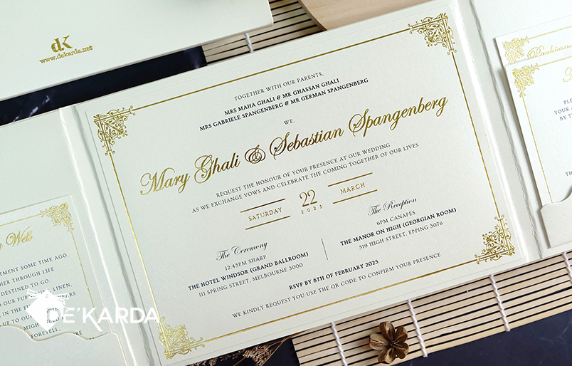 - content 1 page, printed in regular ink, only the bride and groom names in hot foil