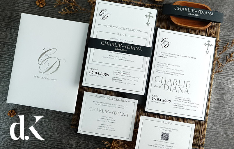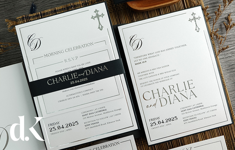 This sophisticated wedding collection is a premium single hardcover invitation, elevated by a striking black paper band with elegant silver foil printing. The hardcover showcases a beautiful script monogram on shimmer white paper, while the coordinating band displays the couple's names in luxurious foil that catches the light beautifully. The comprehensive suite includes multiple inserts for morning celebration, RSVP with QR code, and ceremony details, all maintaining the refined black and white aesthetic with religious cross motifs. This innovative paper band design adds a modern architectural element while providing key information at first glance. The unique hardcover format with foil-stamped band offers couples a distinctive presentation that combines structural elegance with premium finishing techniques for a truly memorable announcement.
