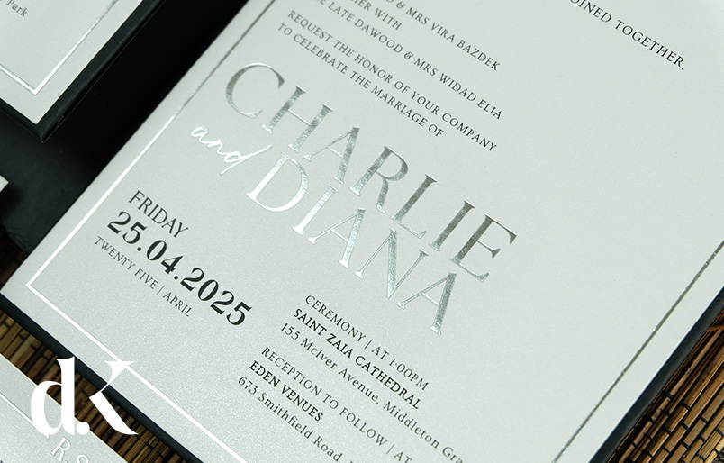 - content 1 page, printed in regular ink, only the bride and groom names in hot foil