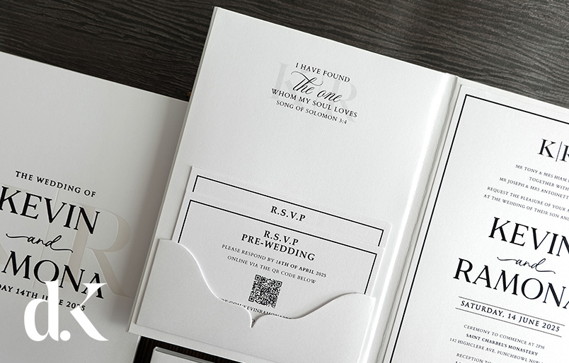 Embrace timeless sophistication with our Classic Monochrome Bifold Hardcover Wedding Invitations. This elegant black and white suite features a distinctive bifold design that opens like a keepsake book, revealing your wedding details in striking typography with elegant script accents. Each suite includes complimentary RSVP cards with a QR code linked to your free digital RSVP website for effortless guest responses. Personalize the typography, layout, and wording to perfectly reflect your unique style. Contact our Customer Service team for assistance with customization and ordering.